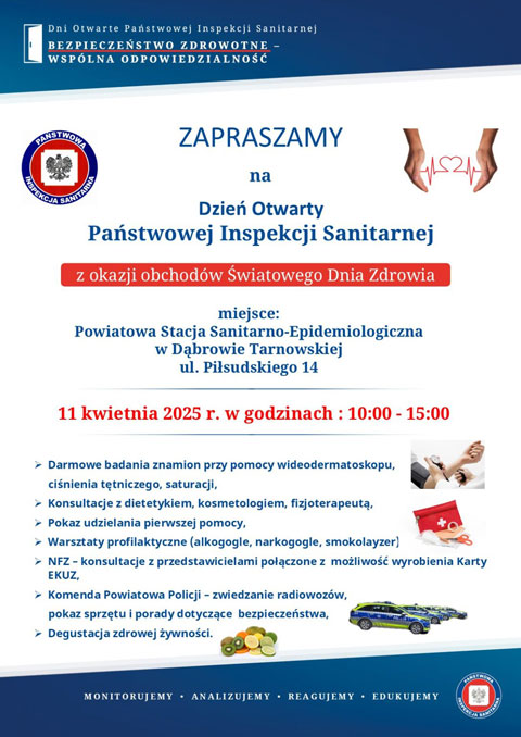 Państwowy Powiatowy Inspektor Sanitarny w Dąbrowie Tarnowskiej serdecznie zaprasza na Dzień Otwarty Państwowej Inspekcji Sanitarnej w Dąbrowie Tarnowskiej, który odbędzie się 11 kwietnia 2025 r. w godzinach 10:00 – 15:00 w siedzibie Powiatowej Stacji Sanitarno- Epidemiologicznej w Dąbrowie Tarnowskiej, ul. Piłsudskiego 14.