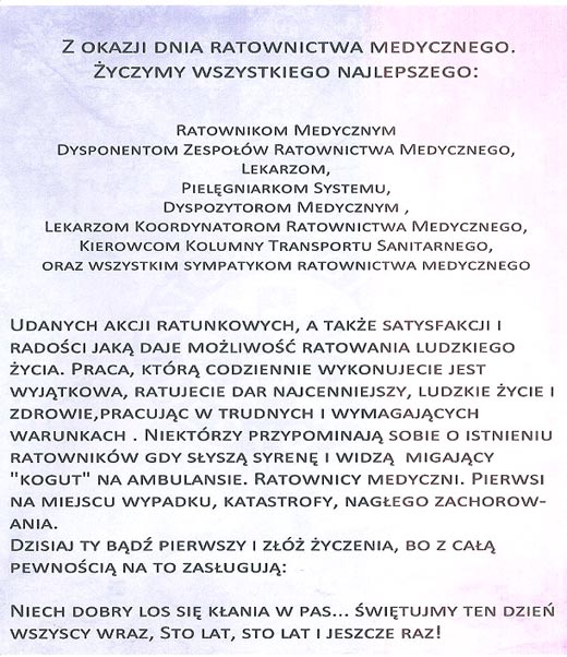 tak się składa że mam dolegliwość przy której musi byc pomoc pogotowia i zawsze mi pomogli na miejscu lub zabierajac na izbę przyjęć za co serdecznie chcę podzienkować i złozyc serdeczne życzenia dla wszystkich ratownikow wszystkiego najlepszego