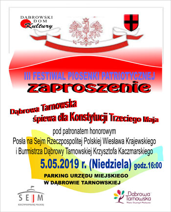 Przypominamy o naszej propozycji patriotycznej na jutro (5 maja) – wspólnym śpiewaniu dla Konstytucji 3 Maja. Impreza odbędzie się pod patronatem honorowym Wiesława Krajewskiego – Posła na Sejm RP i Krzysztofa Kaczmarskiego – Burmistrza Dąbrowy Tarnowskiej.