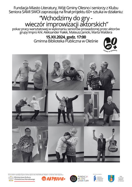 Fundacja Miasto Literatury, Wójt Gminy Olesno, Stowarzyszenie Klub Seniora „Sami Swoi” w Oleśnie i Gminna Biblioteka Publiczna w Oleśnie zapraszają na podsumowanie projektu „60+ sztuka w działaniu”, które odbędzie się 15.12.2024 roku o godzinie 17:00 w bibliotece.