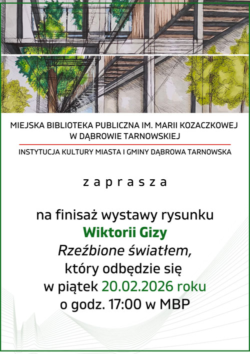 Miejska Biblioteka Publiczna im. Marii Kozaczkowej w Dąbrowie Tarnowskiej zaprasza na finisaż wystawy rysunku Wiktorii Gizy pt. „Rzeźbione światłem”, który odbędzie się 20 lutego 2026 roku, o godz. 17:00 w MBP.