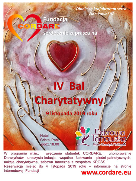 Serdecznie zapraszamy Państwa na IV Bal Charytatywny Fundacji CORDARE, który odbędzie się w sobotę – 9 listopada 2019 roku. Patronat nad balem objął tradycyjnie Burmistrz Dąbrowy Tarnowskiej, Krzysztof Kaczmarski.