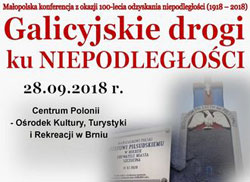 Samorząd powiatowy oraz Komitet organizacyjny serdecznie zapraszają do udziału w małopolskiej konferencji naukowej z okazji 100 – lecia odzyskania niepodległości (1918-2018), która odbędzie się w dniu 28 września 2018 roku o godz. 9.00 w Centrum Polonii – Ośrodku Kultury, Turystyki i Rekreacji w Brniu.
