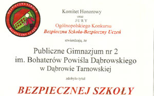 Publiczne Gimnazjum nr 2 im.Bohaterów Powiśla Dąbrowskiego w Dąbrowie Tarnowskiej zostało laureatem Ogólnopolskiego Konkursu Bezpieczna Szkoła – Bezpieczny Uczeń, uzyskało certyfikat Bezpiecznej Szkoły oraz zostało zaliczone do członków Ogólnopolskiego Klubu BEZPIECZNE SZKOŁY.