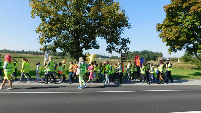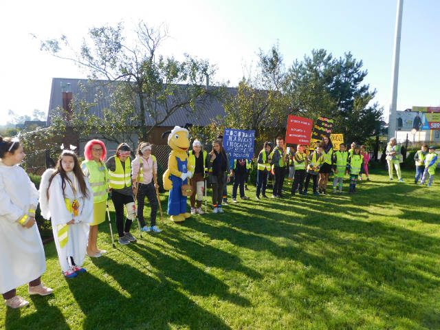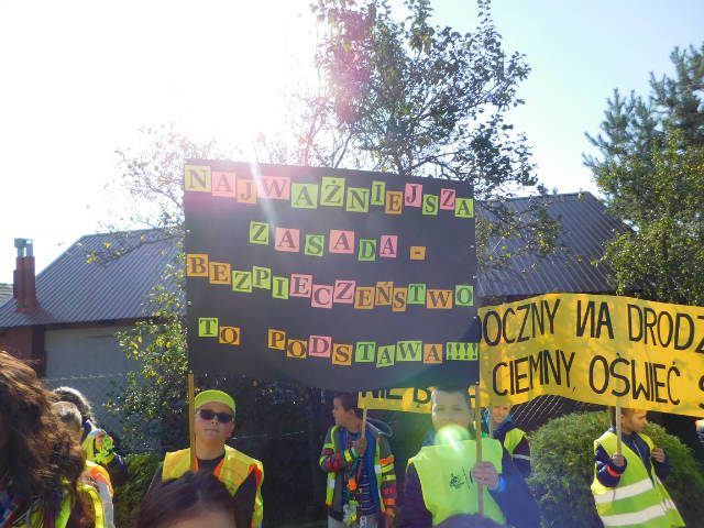 Po utworzeniu się kolumny, odblaskowy korowód prowadzony przez Policję wyruszył spod szkoły. Wszyscy uczniowie ubrani byli w kamizelki odblaskowe. Elementem przykuwającym uwagę były opaski odblaskowe. Każda z klas wykonała transparent z hasłem promującym noszenie odblasków, a podczas marszu skandowała swoje motta. Dzieci deklamowały wierszyki o tematyce bezpieczeństwa. Uczniowie klasy VII wcielając się w role aniołów i osób poszkodowanych w wypadkach drogowych, w ten sposób chciały zaapelować do kierowców, aby zwrócili większą uwagę na bezpieczeństwo swoje i innych na drodze. Dodatkowym wsparciem i atrakcją naszej akcji była maskotka „Mrówki”. Kierowcy i mieszkańcy żywo reagowali na przemarsz dzieci.