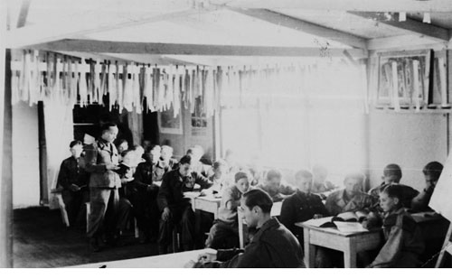 Wnętrze baraku w Szczucinie. S. Świerzb w trakcie lekcji z najmłodszymi junakami. Ta sala była także sypialnią [DRŚ].