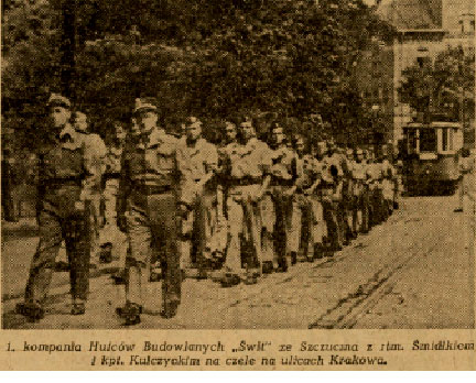 Osoba wicewoj. inż. Bronisława Kuleszy, jako komendanta Okręgu Hufców Budowlanych Nr. 3. zapewnia poparcie władz, a wytężona praca kadry z szefem sztabu rtm. Śmiałkiem i dowódcami kompanii kpt. Kulczyckim [Szczucin – przyp. KS] i kpt. Pyrdem [Dobra – przyp. KS] realizuje idee i pokonuje szereg trudności i nieufności w terenie. Sformowana w lutym pierwsza kompania w Szczucinie może pochlubić się już odbudową trzech wzorowych domów rodzinnych dla gospodarzy, odbudową jednego domu od fundamentów, rozpoczętą budową szkoły powszechnej oraz budową czterech prowizorycznych baraków szkolnych. Propagandę rzeczową szerzą obydwie kompanie przez sprzedawanie odbudowującym się okolicznym mieszkańcom wyrabianej przez siebie dachówki” – pisał z początkiem sierpnia 1947 r. redaktor „Dziennika Polskiego” Kazimierz Zimnał i dodawał: „Jeszcze niedawno, gdyby mnie kto zapytał, co to jest „Świt”, dałbym na pewno zbywającą odpowiedź – no wie pan, to są młodzieżowe hufce budowlane – i po kilku ogólnikowych zdaniach, że potrzebne i pożyteczne, że pracują i coś pisano już o nich, przeszedłbym na bardziej znany mi temat. Dopiero bezpośrednie zetknięcie się z „świtowcami”, poznanie ich hasła pracą zdobędziesz wszystko, wywarło głębsze wrażenie a potem wniosek, że jednak społeczeństwo, które albo nic, albo niewiele wie, o tej świeżej organizacji – powinno- ją poznać29.