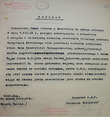 Na ogólnym zebraniu w dniu 7 VII 1953 r. podjęła zobowiązanie w związku z 10 rocznicą utworzenia Polskiego Komitetu Wyzwolenia Narodowego oraz 1 rocznicy uchwalenia przez Sejm Konstytucji PRL, rozpoczęcia z dniem 20 VII 1953 r. pogotowia przeciwpożarowego, jako akcji żniwno-omłotowej, doprowadzenia sprzętu pożarniczego do stanu gotowości bojowej oraz oczyszczenie placu wokół remizy. Z meldunku przesłanego przez Komendanta Władysława Grzesiaka i zastępcy Komendanta do spraw Kulturalno-Oświatowych dowiadujemy się, że zobowiązania zostały wykonane, a „nadto OSP zobowiązała się brać czynny udział w poszukiwaniu stonki ziemniaczanej mając na uwadze jakim szkodnikiem jest stonka na odcinku gospodarczym”. Ścisła współpraca pomiędzy ZMP i SP funkcjonowała wszędzie tam, gdzie istniały te organizacje. Przykładowo w dn. 26 IV 1950 r. Prezydium GRN w Szczucinie poinformowało Powiatową Radę Narodową, że w skład Gminnego Komitetu do wykonania „Czynu Melioracyjnego” weszli Michał Gądek z ZMP i Roman Chwałek z SP21.