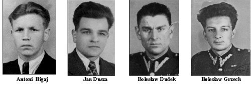 | Bolesław Dudek – s. Wincentego, ur. 28 grudnia 1916 r., zm. 21 maja 1985 r. Oficer śledczy od 1 marca 1945 r. w PUBP Włoszczowa, st. referent i p.o. kierownik PUBP w Pińczowie, potem w dyspozycji WUBP w Krakowie, zastępca szefa PUBP w Dąbrowie Tarnowskiej od 3 grudnia 1946 do 1 maja 1947 r., następnie szef MUBP w Zakopanem, funkcjonariusz WUBP w Krakowie, Lublinie, zwolniony z resortu w stopniu pułkownika MO 30 czerwca 1974 r. |
