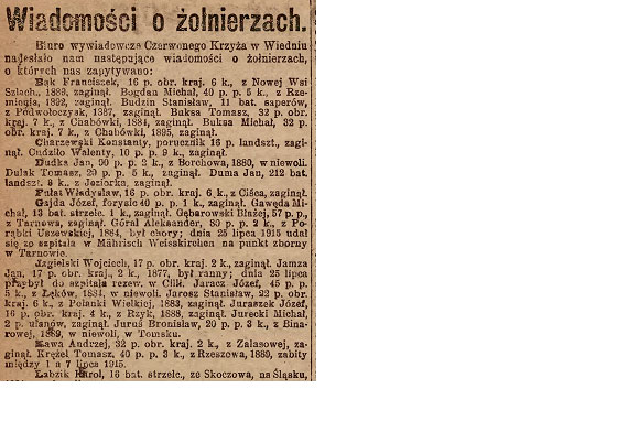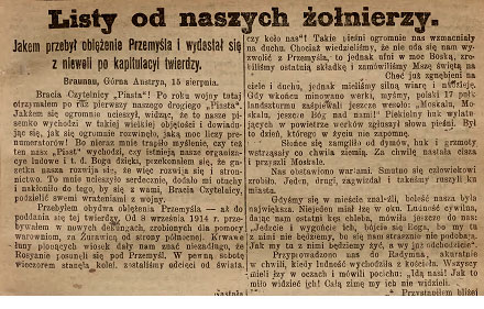 A wciąż kładli ludziom w głowy, że przyszli nas wybawić z pod „awstryjskiego gnietu” [ucisku austriackiego – przyp. KS]. 12 we wtorek, popołudniu, 5 szrapneli uderzyło w mój dom i rozbiło go tak, że tylko jedna ściana się jako tako trzymała. Ubiło jednego oficera, a dieńszczyk, wraz z ścianą wyleciał na księży ogród, przeszło 40 metrów, żywy wprawdzie, ale niebawem z ran pomarł. Całe szczęście, żem z rodziną wyszedł rano do wsi sąsiedniej; bo jużbym nie żył. W tym dniu zabiło Dymona Wojciecha, dom mu rozburzywszy; stajnię Klucza i Gadkowy tenże los spotkał.