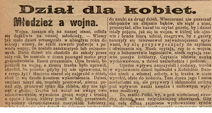 | Chwalili Pana Boga, mówili, że przychodzą wyswobodzić ich z pod panowania Germana, z zależności żydowskiej, nadać im z obszarów dworskich więcej roli i wynagrodzić z polecenia cara wszelkie szkody, jakie im wyrządziły wojska austriackie i Germany. Wyście bracia nasi, już, a my wasi – wojska austriackie już nie istnieją, bo wybite, cesarz umarł ze zmartwienia, a ten młody uciekł do Ameryki, broni się jeszcze German, ale cesarz Wilhelm zwariował wskutek niepowodzenia Germanów” – przekonywali chłopów nawet prości żołnierze. Chłop jednak widział swoje, a to co widział, nie mogło go w żaden sposób przekonać, co do szczerości intencji tych „oswobodzicieli” […]. |