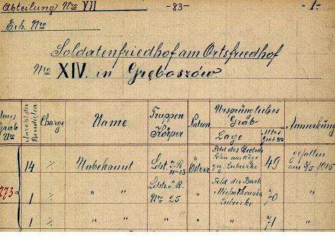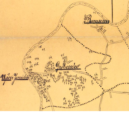 Groby przeznaczone do ekshumacji po przejściu frontu na terenie działania posterunku żandarmerii w Gręboszowie, ANKr, Wojskowy Urząd Opieki nad Grobami Wojennymi Okręgu Nr V, sygn. GW 37].