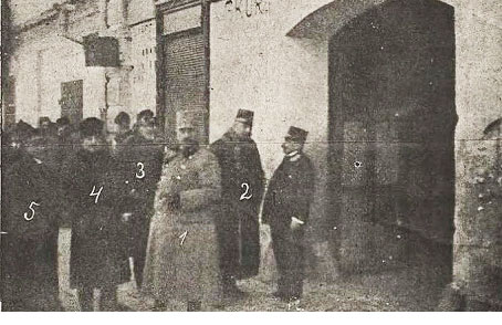 Przed starostwem w Dąbrowie – 1916 r. 1-Namiestnik gen. Colard, 2-ks. Hohenlohe, 3-min. Morawski, 4-wiceprezydent Krakowa prof. Nowak, 5-nadinż. Jackowski [„Nowości Ilustrowane” 1916, nr 12].