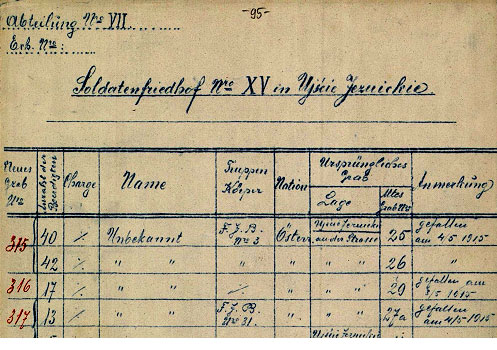 Uzupełniając należy wspomnieć, że po przemarszach wojsk i toczonych walkach pozostały rozrzucone na przestrzeni całej parafii Gręboszów groby żołnierzy obu armii, które należało przenieść na tworzone w tym celu cmentarze wojenne. Płytkie pochówki groziły bowiem zakażeniem cieków wodnych i wybuchem epidemii tyfusu, cholery i innych chorób zakaźnych – żywa była jeszcze wówczas pamięć o epidemiach z końca XIX wieku. Kiedy więc front przesunął się na wschód, a wraz z nim Komendy Etapów, wszelkie sprawy grobownictwa wojskowego podporządkowano na interesującym nas obszarze Dowództwu Okręgu Wojskowego w Krakowie. To właśnie ten organ miał uporządkować pobojowiska i zapobiec epidemii. Na omawianym terenie sprawa była tym bardziej pilna, że wojska rosyjskie zostawiały swoje pozycje w tak straszliwy sposób zanieczyszczone, że wydano nawet specjalny rozkaz nakazujący ich natychmiastowe zasypywanie. W dn. 3 listopada 1915 roku w wiedeńskim Ministerstwie Wojny utworzony został pod numerem IX, posiadający szerokie uprawnienia Wydział Grobów Wojennych [niem. IX Kriegsgräber Abteilung], działający z niewielkimi zmianami organizacyjnymi do 1919 roku. Jego zadaniem było ewidencjonowanie poległych, ekshumowanie i komasowanie zwłok na wybranych miejscach, a także projektowanie, budowa i dekoracja cmentarzy wojennych [K. Struziak, Szczucińskie drogi do wolności, w druku]..