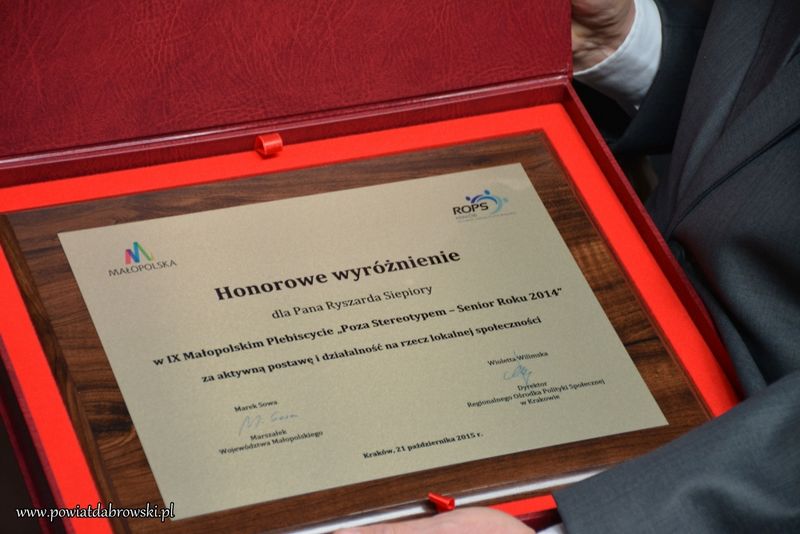 21 października 2015 r. mieszkaniec naszego powiatu Ryszard Siepiora z Dąbrowy Tarnowskiej otrzymał honorowe wyróżnienie w organizowanym przez Regionalny Ośrodek Polityki Społecznej w Krakowie, IX Małopolskim Plebiscycie „Poza Stereotypem – Senior Roku 2014”.