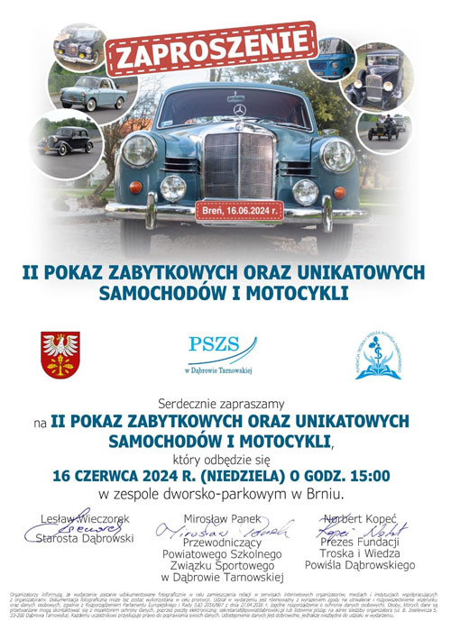 W niedzielę 16 czerwca 2024 r. odbędzie się II Pokaz Zabytkowych i Unikatowych Samochodów oraz Motocykli organizowany w ramach IV Powiatowego Dnia Bezpieczeństwa.