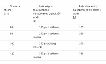 po ponownym napełnieniu studni wodą, odmierzoną według tabeli ilość wapna chlorowanego dokładnie rozetrzeć w wiadrze z niewielką ilością wody (na papkę podobną do śmietany), dopełnić wiadro wodą, rozmieszać, po czym całą zawartość wlać do studni
