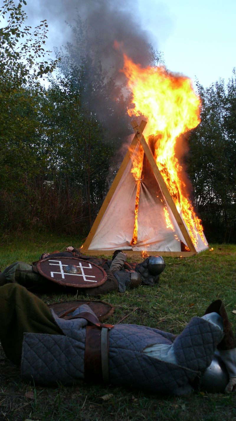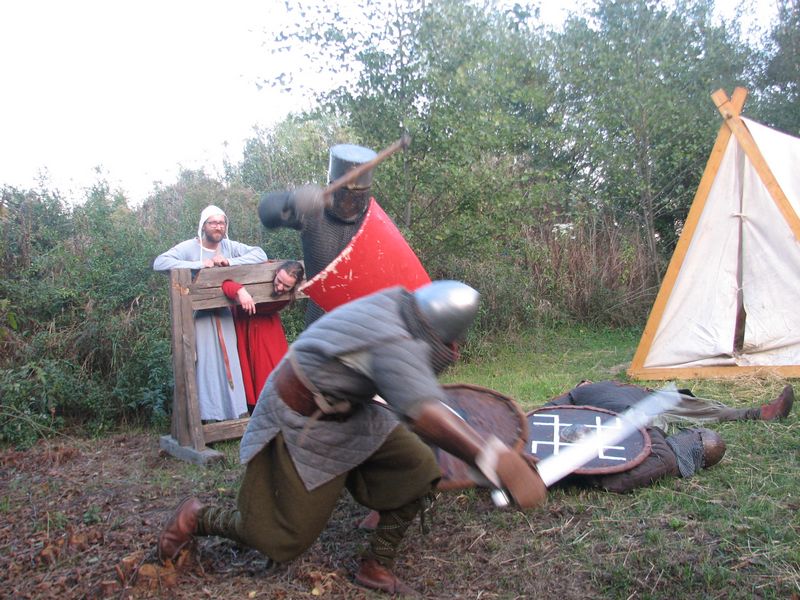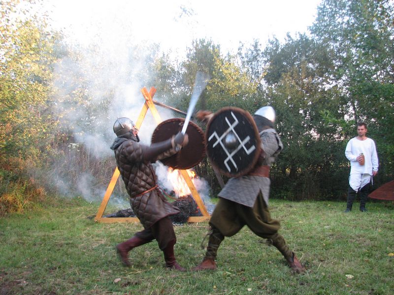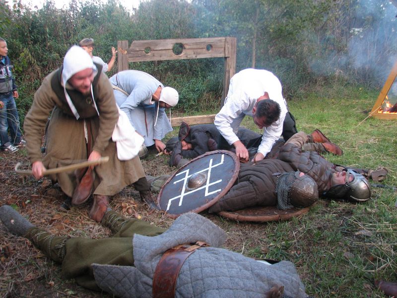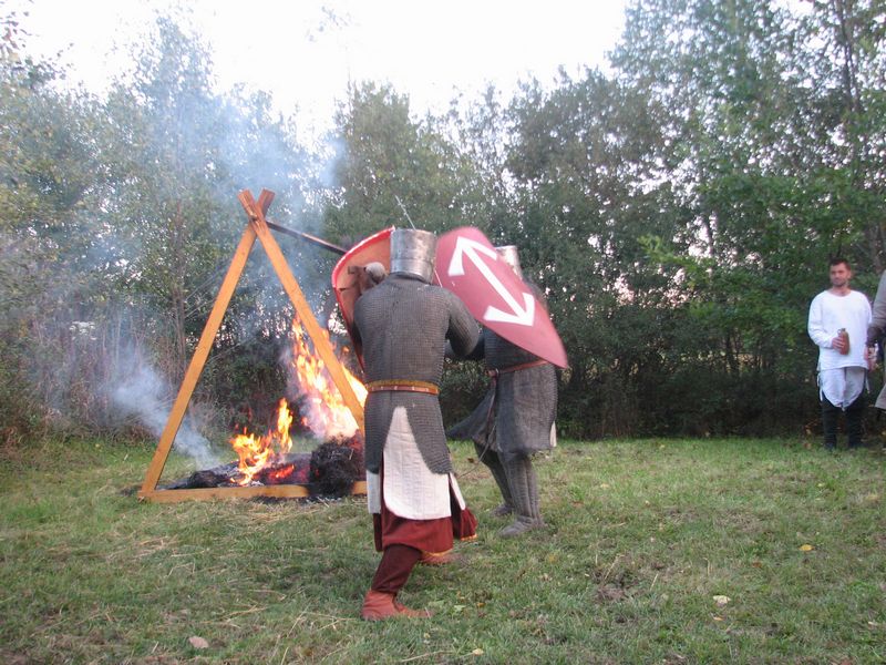 Pod koniec dnia banda pogan uprowadziła chrześcijanina Macieja i torturowała go w swym pobliskim obozowisku. Na szczęście nadeszła odsiecz – przybyli z różnych stron chrześcijańscy rycerze jak za czasów krucjat wyrżnęli do nogi pogan a ich siedzibę spalili. Później nad trupami pojawili się wędrowni złodzieje zdzierając z nich co wartościowsze przedmioty i elementy ubioru. Na zakończenie odbyło się kilka zbiorowych i indywidualnych rycerskich pojedynków oraz pokaz sprawności fizycznej. Całość zakończyła się zgodnie planem o godz. 18. Dla tych, którzy mieli jeszcze niedosyt pozostał drugi etap weekendu z historią – niedzielny Turniej Rycerski na zamku w Dębnie organizowany przez MOT.
