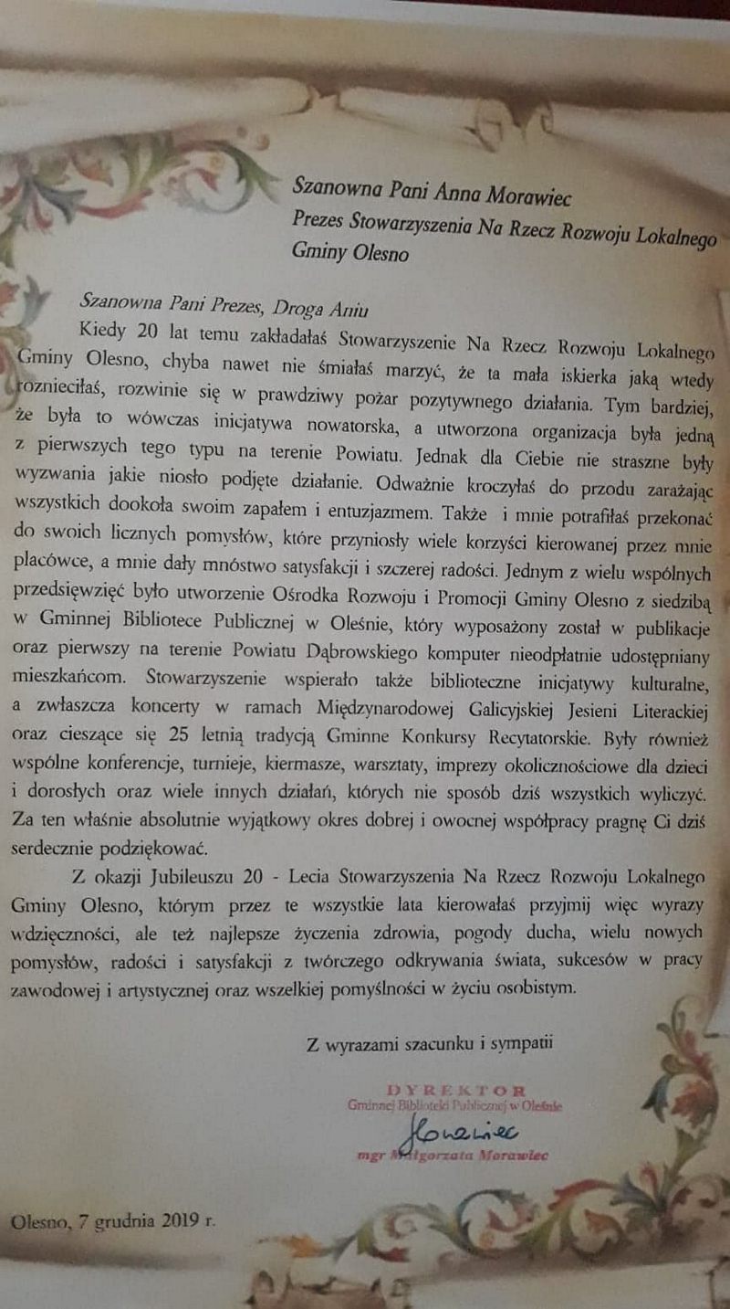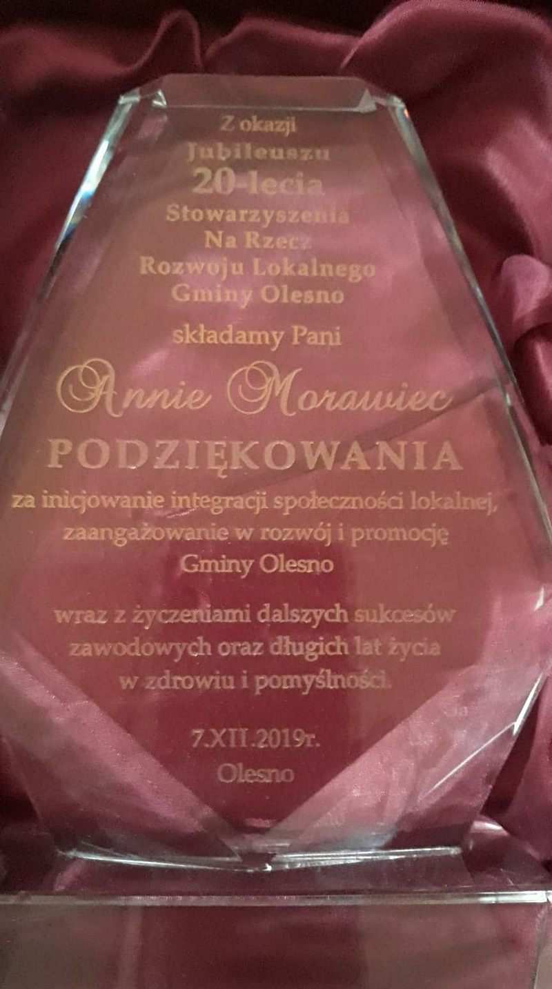 Relacja z Jubileuszu 20 –lecia Stowarzyszenia Na Rzecz Rozwoju Lokalnego Gminy Olesno.