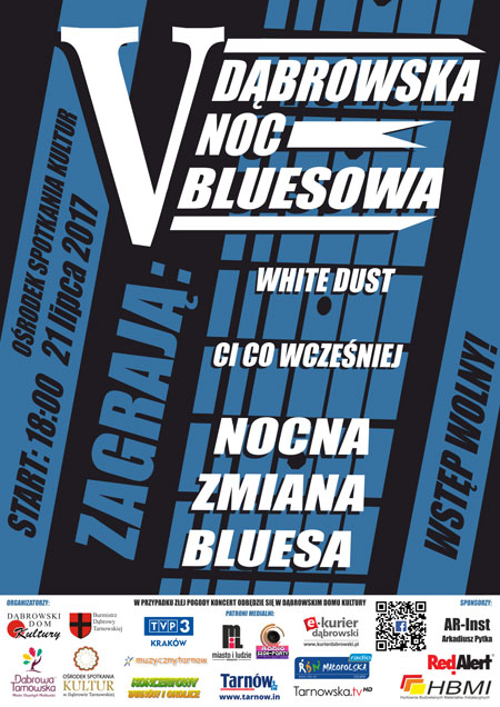 Gwiazdą wieczoru jest „Nocna Zmiana Bluesa” – Ikona polskiej muzyki bluesowej (www.nocnazmianabluesa.pl ) Po raz pierwszy – staraniem Dąbrowskiego Domu Kultury – wystąpi zespół takiego kalibru! Najpopularniejszy polski wykonawca bluesa – Sławek Wierzcholski i stworzona przez niego „Nocna Zmiana Bluesa” w ciągu 30 lat nieprzerwanej działalności osiągnęli sukcesy, którymi można by obdzielić znacznie większe grono artystów! Dwadzieścia wydanych płyt, nagrania z amerykańskimi gwiazdami bluesa jak m.in. Charlie Musselwhite czy Louisiana Red, koncerty supportujace gwiazdy bluesa światowego formatu: B.B.King (Warszawa 1996) czy Blues Brothers (Norymberga 1989) . Kilka tysięcy koncertów w Polsce i praktycznie w całej Europie, także w USA, a nawet w Zimbabwe!