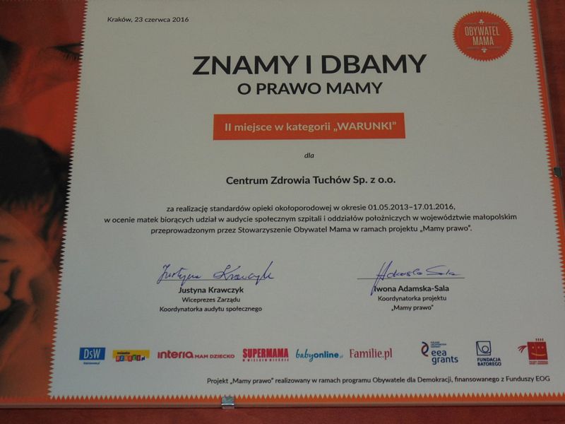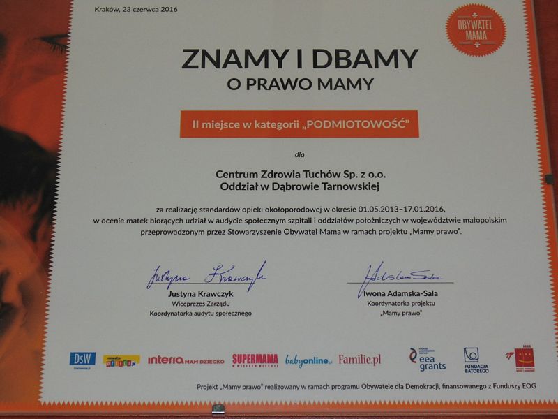 Drugie miejsce Centrum Zdrowia Tuchów w województwie w zakresie warunków porodu. Czwarte miejsce w ogólnym rankingu standardów opieki okołoporodowej wśród szpitali o pierwszym stopniu referencyjności. Trzecie miejsce Centrum Zdrowia Dąbrowa Tarnowska w tej ostatniej klasyfikacji i drugie miejsce dąbrowskiej porodówki w kategorii podmiotowość.