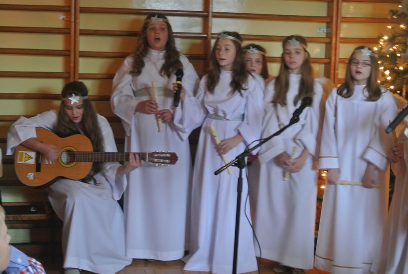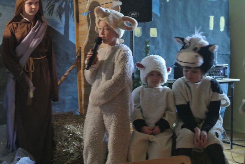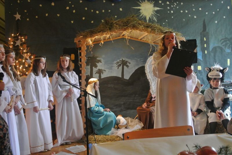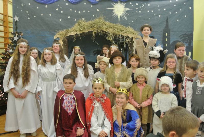 Nie zabrakło również choinki, przy której stał chór aniołów. Spektakl przedstawiał historię Marii, Józefa i małego Jezuska, szukających schronienia. Do swego domu – ubogiej stajenki zaprowadziły Świętą Rodzinę zwierzęta oraz pasterze. Przedstawienie zawierało scenki z życia nowonarodzonego dzieciątka, pasterzy, mędrców, dzieci oraz aniołów. Występy przeplatane były kolędami i pastorałkami, którym towarzyszyła gra na fletach, gitarze i keyboardzie w wykonaniu naszych uczniów. Wszyscy aktorzy, starsi i młodsi, świetnie się spisali.