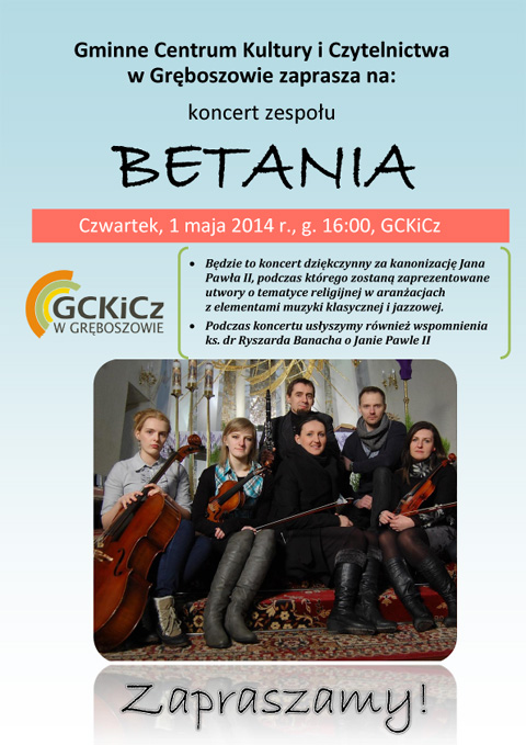 Gminne Centrum Kultury i Czytelnictwa w Gręboszowie zaprasza na koncert zespołu BETANIA z Tarnowa, który odbędzie się 1 maja (czwartek) br. o godzinie 16.00.