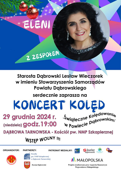 Starosta Dąbrowski Lesław Wieczorek, w imieniu Stowarzyszenia Samorządów Powiatu Dąbrowskiego, zaprasza na tegoroczny koncert kolęd w wykonaniu wyjątkowej artystki – Eleni wraz z zespołem, który odbędzie się 29 grudnia 2024 r. (niedziela) o godz. 19:00 w kościele pw. NMP Szkaplerznej w Dąbrowie Tarnowskiej.