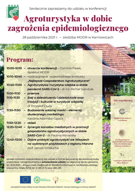 Powiatowy Zespół Doradztwa Rolniczego w Dąbrowie Tarnowskiej zaprasza do udziału w małopolskiej konferencji agroturystycznej, która odbędzie się w siedzibie Małopolskiego Ośrodka Doradztwa Rolniczego w Karniowicach lub w formie on-line, poprzez łącza internetowe.
