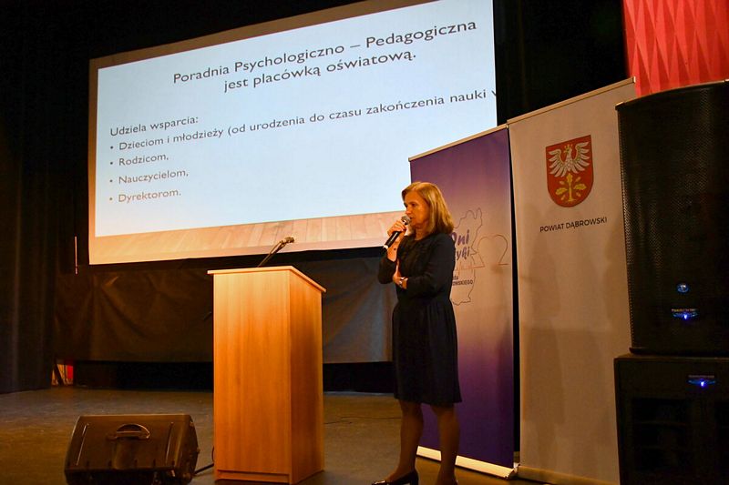 – Dyrektor Poradni Psychologiczno-Pedagogicznej w Dąbrowie Tarnowskiej Bogusława Molak omówiła działalność kierowanej przez nią jednostki w zakresie udzielania pomocy psychologicznej dzieciom i młodzieży;