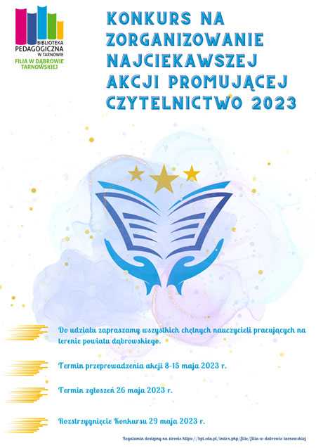 Biblioteka Pedagogiczna w Tarnowie Filia w Dąbrowie Tarnowskiej zaprasza nauczycieli wszystkich etapów nauczania, pracujących na terenie powiatu dąbrowskiego do wzięcia udziału w Konkursie na zorganizowanie najciekawszej akcji promującej czytelnictwo 2023.