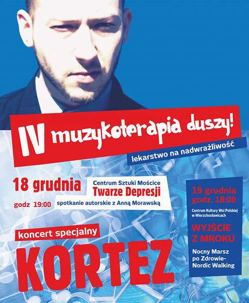 Koncert KORTEZA to opowieść o miłości i jej braku. Chwilach zwątpienia i szczęścia. Próbach pogodzenia się ze światem i samym sobą. Nadwrażliwość i jej różne odcienie to również motyw łączący wszystkie wydarzenia w ramach Muzykoterapii. Przed koncertem, o godzinie 19:00 zapraszamy na filiżankę gorącej czekolady i spotkanie z Anną Morawską, autorką książki i akcji społecznej pt. „Twarze Depresji”. Książka jest próbą zapisu doświadczeń ludzi znanych i popularnych oraz ich zmagań w walce z depresją. Podczas spotkania, w formie wywiadów filmowych, opowiedzą o nich Kamil Sipowicz i Andrzej Bober.