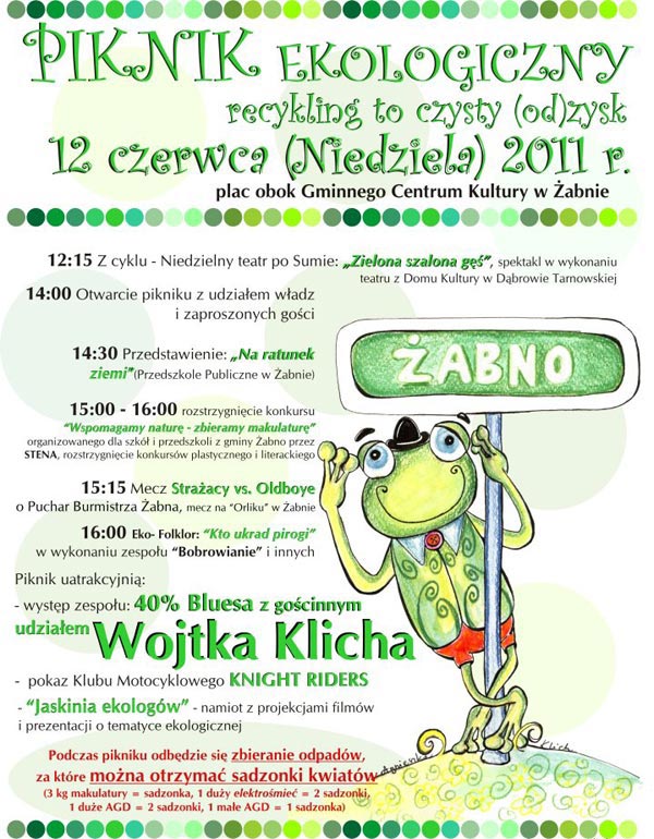 Eko- piknik w Żabnie będzie dniem nie tylko poświęconym na pozbywanie się niepotrzebnych urządzeń, ale przede wszystkim dniem dobrej zabawy z ekologicznym przesłaniem. Tego dnia odbędą się finały konkursów o tematyce związanej z czystą naturą, powstanie specjalny namiot, w którym emitowane będą prezentacje multimedialne o tematyce ekologicznej, dla dzieci dzień rozpocznie się od przedstawienia na deskach sceny Gminnego Centrum Kultury.