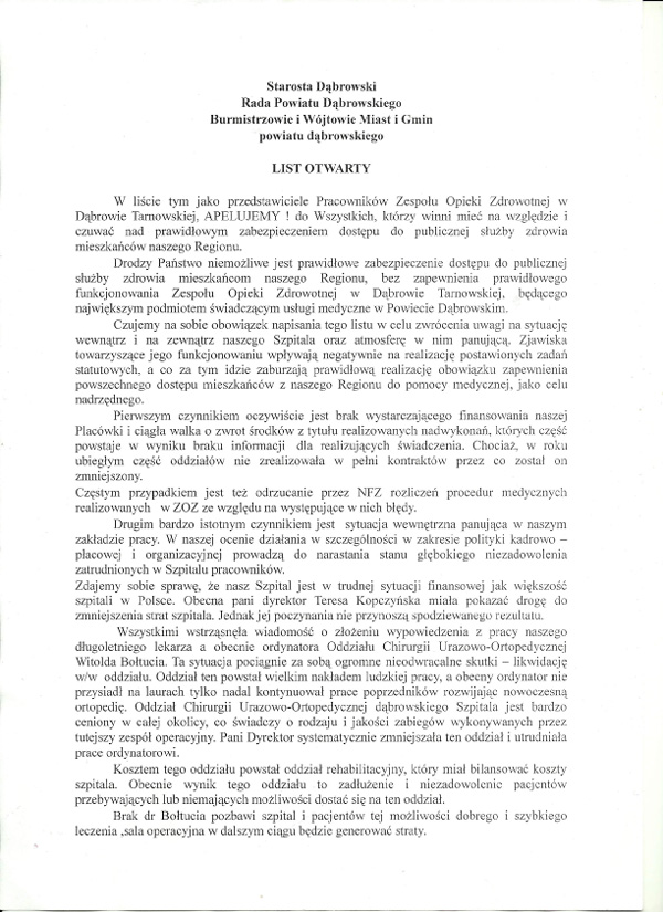 List Otwart w sprawie funkcjonowania Szpitala w Dąbrowie Tarnowskiej do: Starosta Dąbrowski, Rada Powiatu Dąbrowskiego Burmistrzowie i Wójtowie Miast i Gmin powiatu dąbrowskiego.
