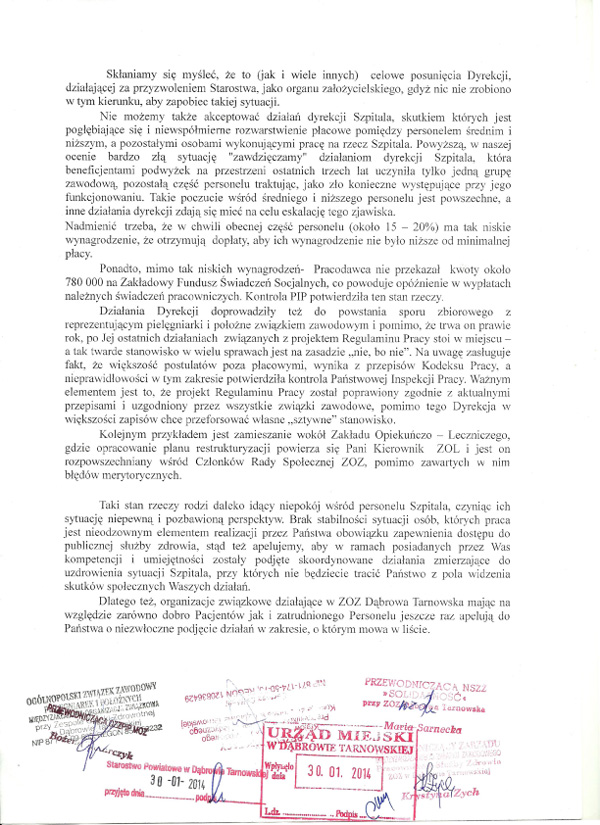 Dlatego też, organizacje związkowe działające w ZOZ Dąbrowa Tarnowska mając na względzie zarówno dobro Pacjentów jak i zatrudnionego Personelu jeszcze raz apelują do Państwa o niezwłoczne podjęcie działań w zakresie, o którym mowa w liście.