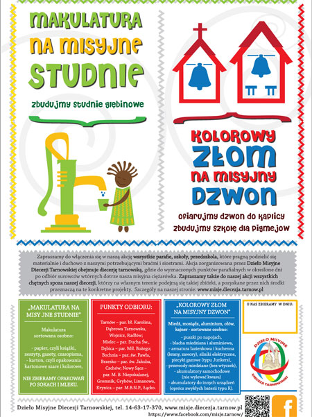 Przekazując kolorowy złom i makulaturę można pomóc misjom. Po sukcesie akcji pod hasłem „Mały bucik dla czarnego brata”, Dzieło Misyjne Diecezji Tarnowskiej ogłasza kolejne akcje charytatywne – „Makulatura na misyjne studnie” oraz „Kolorowy złom na misyjny dzwon”.