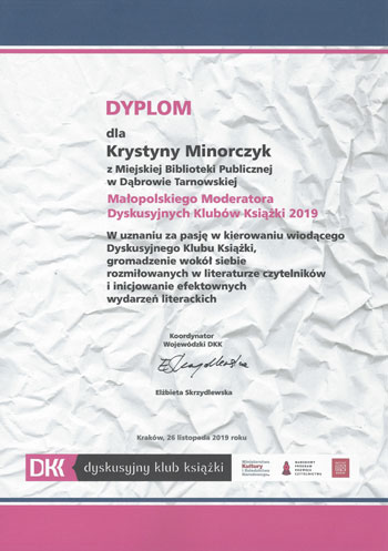 Z przyjemnością zawiadamiamy, że Pani Krystyna Minorczyk pracownik Działu dla Dorosłych i Młodzieży Miejskiej Biblioteki Publicznej im. Marii Kozaczkowej w Dąbrowie Tarnowskiej zdobyła tytuł Małopolskiego Moderatora Dyskusyjnych Klubów Książki 2019.