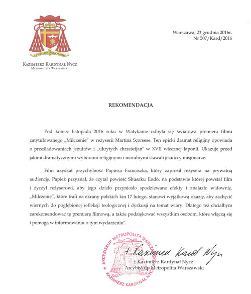 Film uzyskał bardzo przychylną opinię samego Papieża Franciszka, który po oglądnięciu go na specjalnym pokazie przedpremierowym zaprosił reżysera na audiencję prywatną do Watykanu. W Polsce film „Milczenie” promuje list Kardynała Kazimierza Nycza, Arcybiskupa Metropolity Warszawskiego.