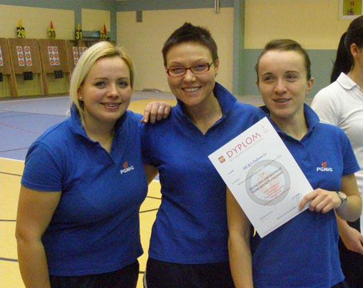 Sobotnie zmagania rozpoczęły się od konkurencji drużynowej. Nasze zawodniczki rozstawione były z numerem 2. Po ciężkich zmaganiach dziewczyny dotarły do półfinału, żeby niestety ulec zaprzyjaźnionemu podkrakowskiemu „Grotowi” Zabierzów. Ostatecznie zawodniczki Dąbrovii w składzie: Katarzyna Mickiewicz, Agata Bulwa, Małgorzata Mickiewicz wywalczyły brązowy medal i zdobyły tytuł II drużynowego wicemistrza Polski na 2013 rok!!