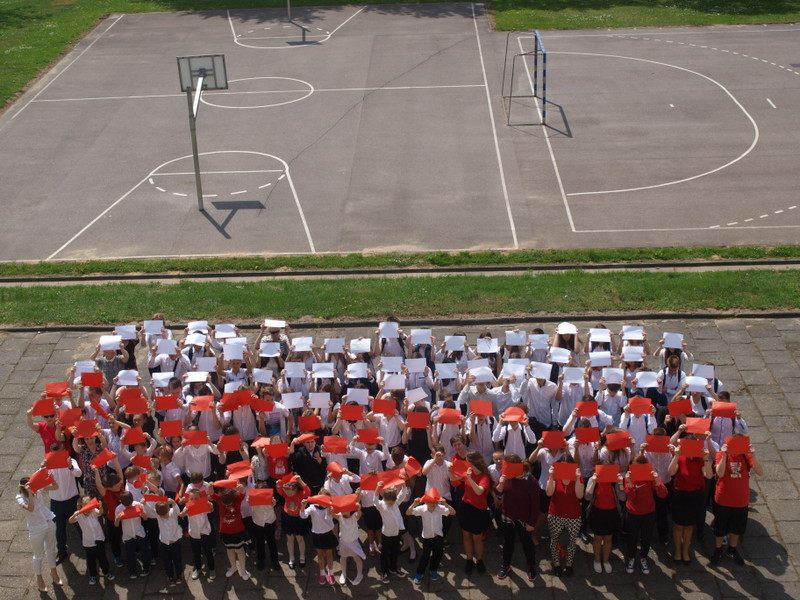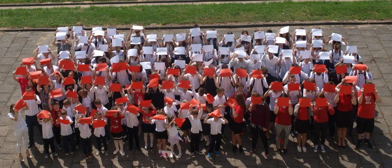 „Żywą flagę” utworzyli wspólnie uczniowie klasy pierwszej i czwartej szkoły podstawowej oraz ich starsi koledzy z klas gimnazjalnych.