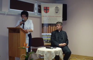 Spotkanie rozpoczęła piosenka braci Golec „Leć muzyczko” i projekcja zdjęć z życia Papieża Jana Pawła II. Przybyłych powitała dyrektor biblioteki Jadwiga Kusior, która opowiedziała o bohaterze spotkania, ks. dr hab. Robercie Bielu, autorze książki o św. Janie Pawle II.
