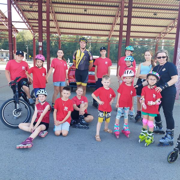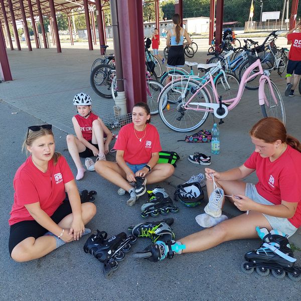 Po trudnym i wymagającym odcinku trasy dotarliśmy do Szczucina gdzie czekał na nas instruktor jazdy na rolkach. Pokazał on naszym adeptom kilka trików, dzięki którym w przyszłości będą mogli bezpieczniej jeździć na rolkach.