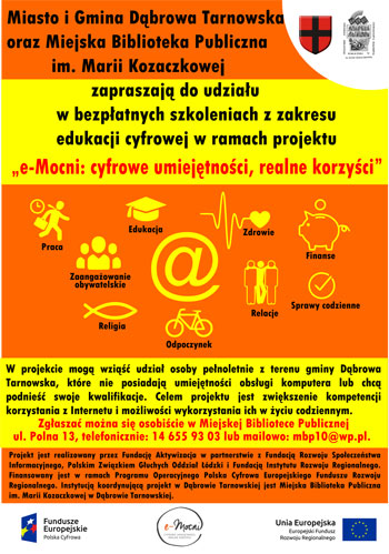 Dzięki projektowi możesz za darmo podnieść swoje umiejętności w sferze obsługi komputera i Internetu. To nic nie kosztuje, musisz się tylko zgłosić do Miejskiej Biblioteki Publicznej im. Marii Kozaczkowej w Dąbrowie Tarnowskiej i przyjść na szkolenie. Pomożemy Ci wypełnić wszystkie konieczne dokumenty. Serdecznie zapraszamy.