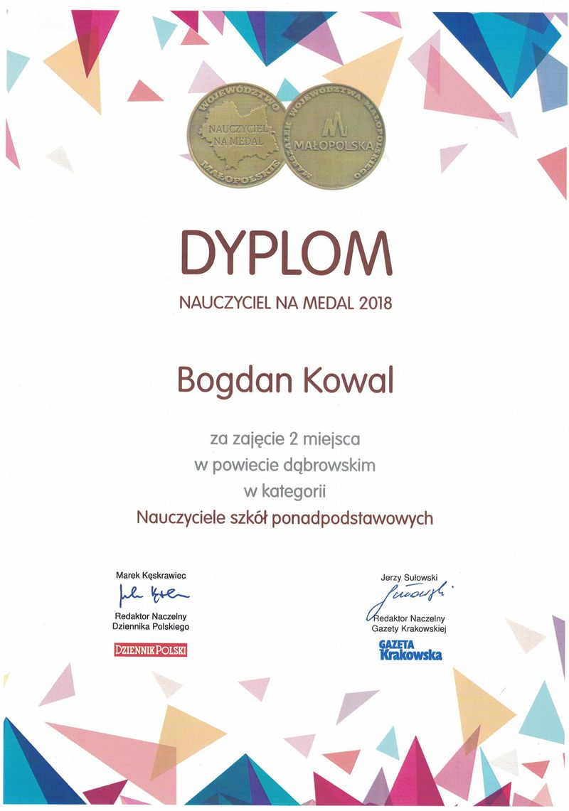Zgłoszenie jest formą wyróżnienia najbardziej charyzmatycznych nauczycieli, a wysoka pozycja w plebiscycie świadczy o sympatii, autorytecie i szacunku, którymi cieszą się oni wśród licznych głosujących. Gratulujemy panu Kowalowi drugiego miejsca w plebiscycie i mamy nadzieję, że jeszcze przez wiele lat będzie z właściwą sobie energią, poczuciem humoru i profesjonalizmem kształcił i wychowywał kolejne pokolenia młodzieży.