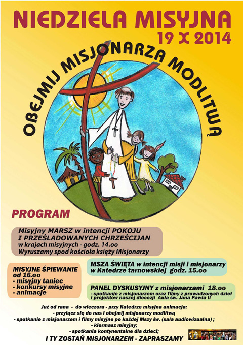 Niedziela Misyjna będzie obchodzona w parafiach diecezji, a szczególnie uroczyście w Tarnowie. W marszu, Mszy św. oraz m.in. w panelu dyskusyjnym wezmą udział przedstawiciele wszystkich środowisk misyjnych diecezji. Do udziału zaproszeni są mieszkańcy Tarnowa i okolic.