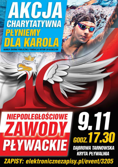 Serdecznie zapraszamy do udziału w Niepodległościowych Zawodach Pływackich, które przeprowadzone zostaną na Krytej Pływalni w Dąbrowie Tarnowskiej 9 listopada 2018 roku o godzinie 17:30.