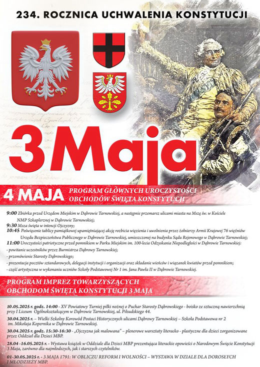 Samorząd Gminy Dąbrowa Tarnowska wraz z Samorządem Powiatu Dąbrowskiego serdecznie zapraszają na uroczyste obchody 234. rocznicy uchwalenia Konstytucji 3 Maja, które odbędą się 4 maja 2025 roku (tj. niedziela) w Dąbrowie Tarnowskiej.