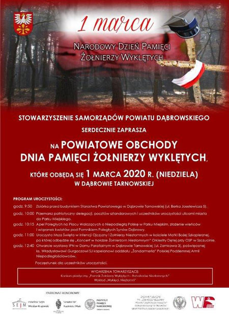 Stowarzyszenie Samorządów Powiatu Dąbrowskiego serdecznie zaprasza wszystkich mieszkańców na Powiatowe Obchody Dnia Pamięci Żołnierzy Wyklętych, które odbędą się w niedzielę 1 marca 2020 roku w Dąbrowie Tarnowskiej.