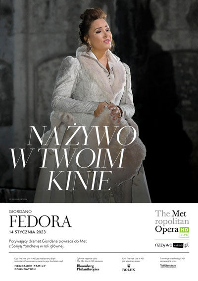 „Fedora”, porywający dramat Giordana, powraca do Met po 25 latach, z Sonyą Yonchevą w tytułowej roli dziewiętnastowiecznej księżniczki, która zakochuje się w mordercy swojego narzeczonego. W roli zbrodniarza, Lorisa Ipanowa, wystąpi znakomity polski tenor Piotr Beczała. Atutem inscenizacji jest wyjątkowa scenografia, która ukaże m.in. pałac w Petersburgu, modny paryski salon i willę w szwajcarskich Alpach.