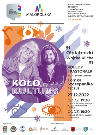 Gminne Centrum Kultury w Żabnie zaprasza na O!PŁATECZKI WOJTKA KLICHA. Koncert kolęd i pastorałek z gościnnym udziałem Tomka Szczepanika z zespołu PECTUS, odbędzie się 27 grudnia 2022 r. w kościele pw. Trójcy Świętej w Łęgu Tarnowskim – Partyniu o godz. 17:30.